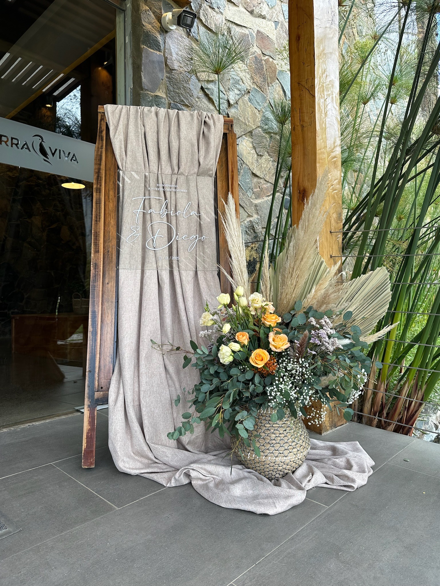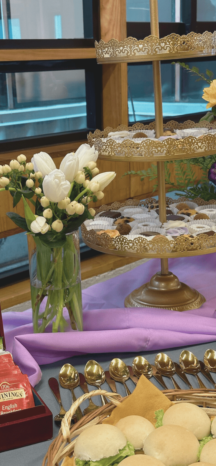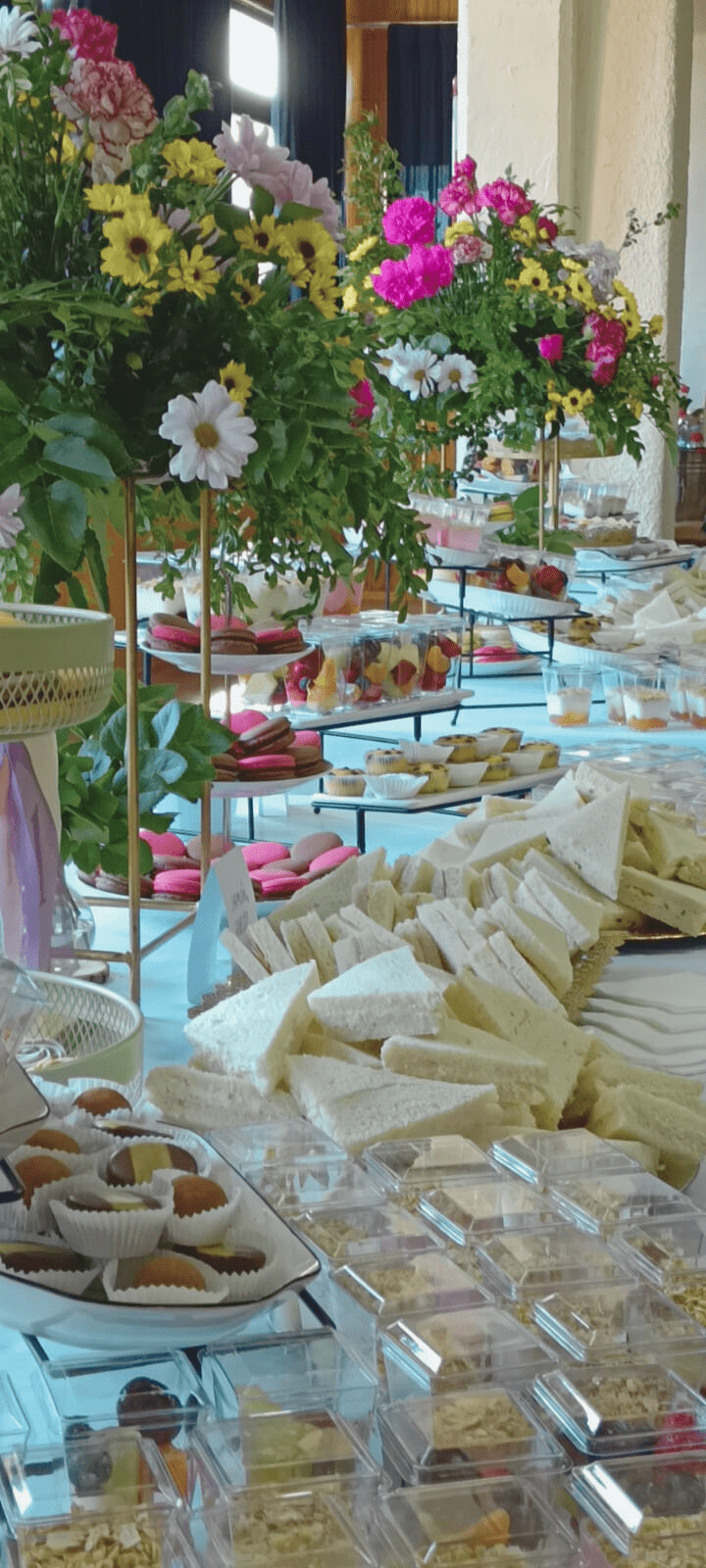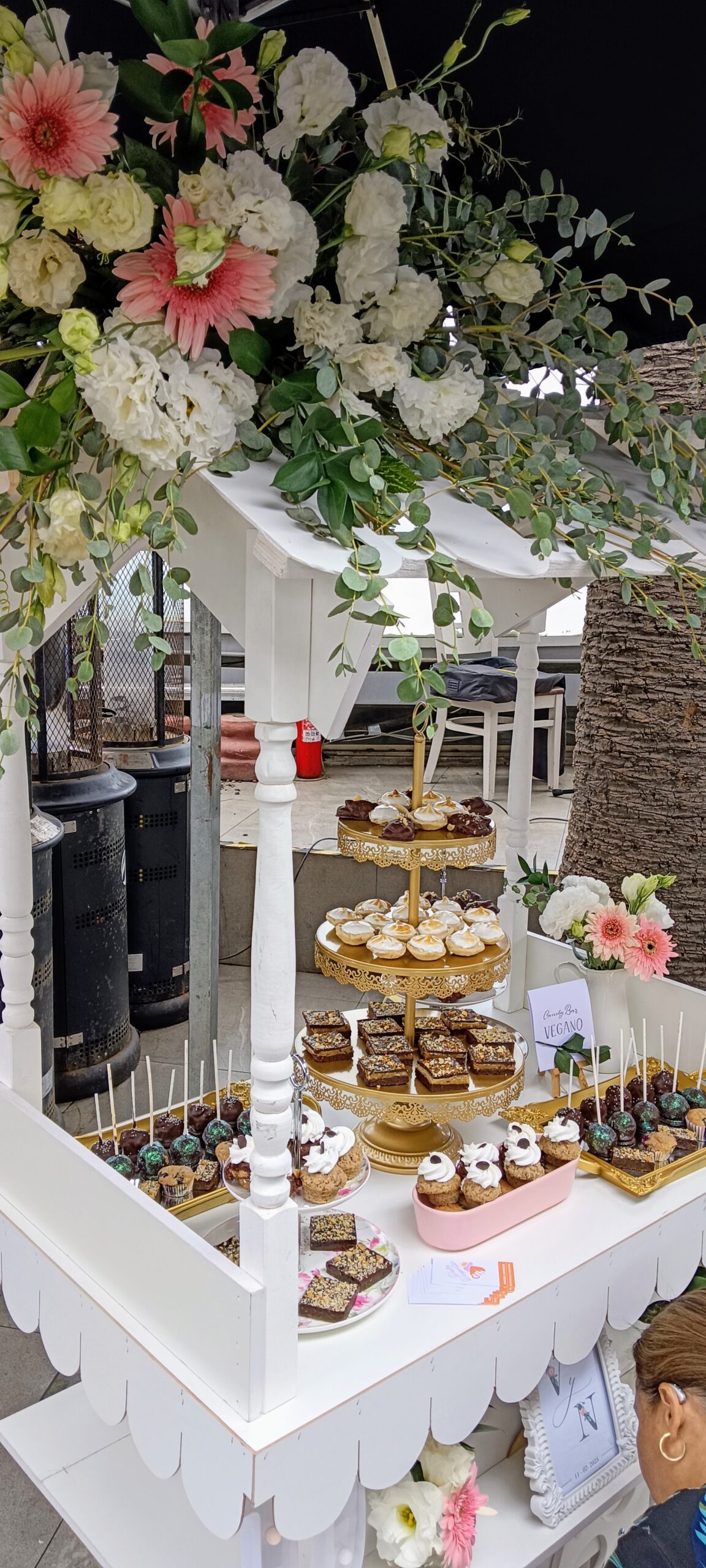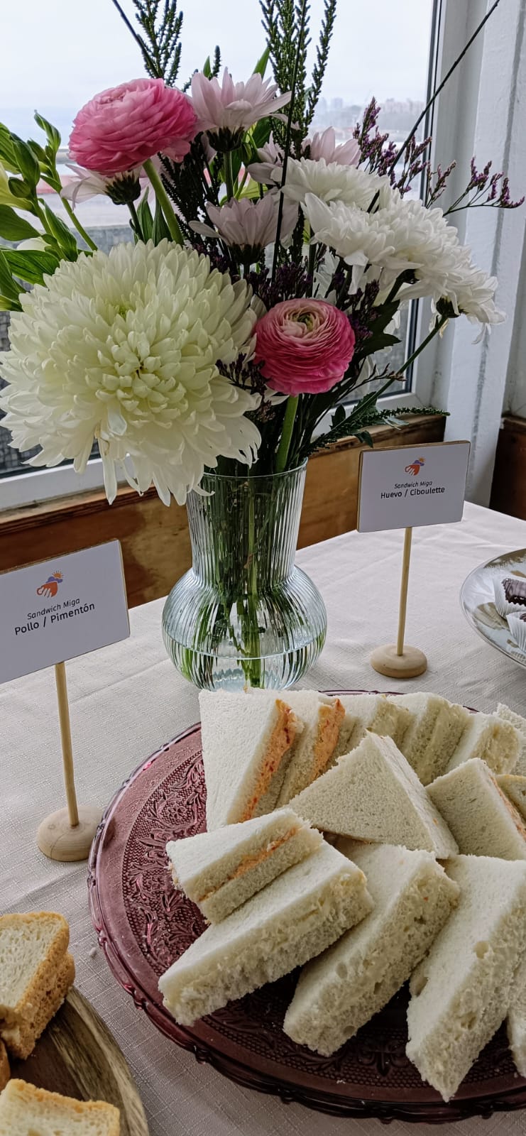 Montaje buffet elegante y temático, cuidadosamente decorado con flores naturales frescas que aportan color y calidez al espacio.