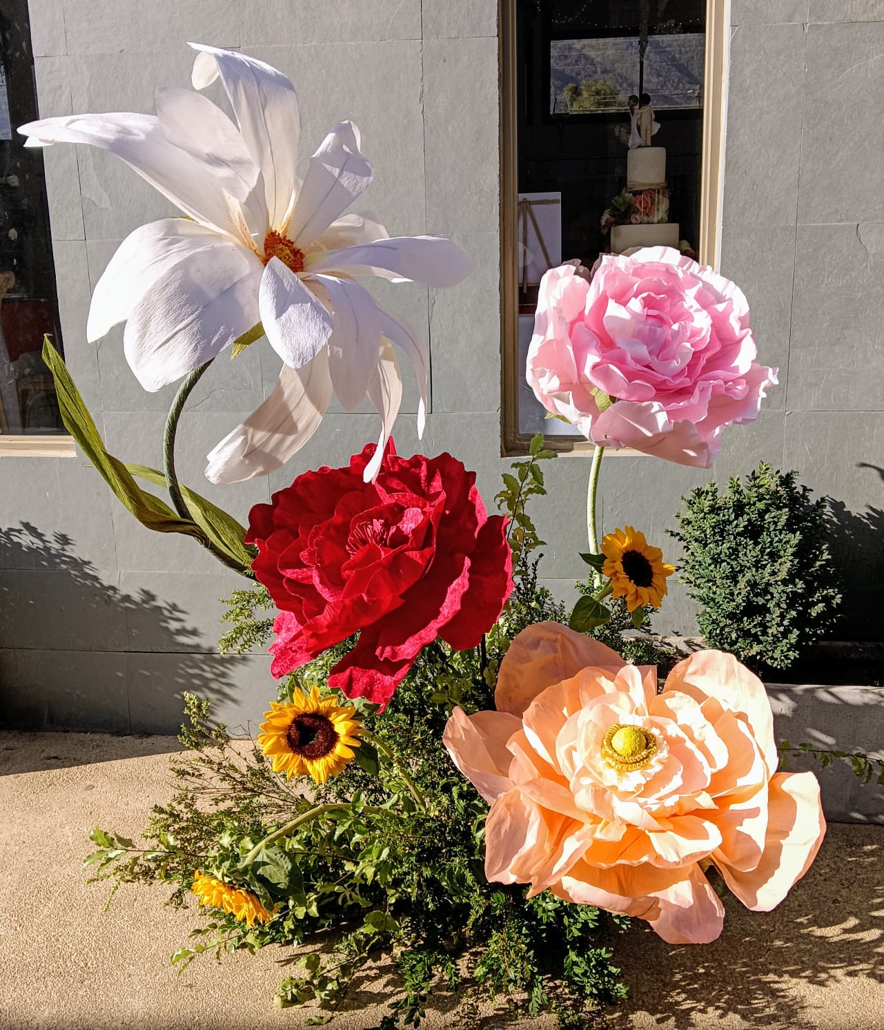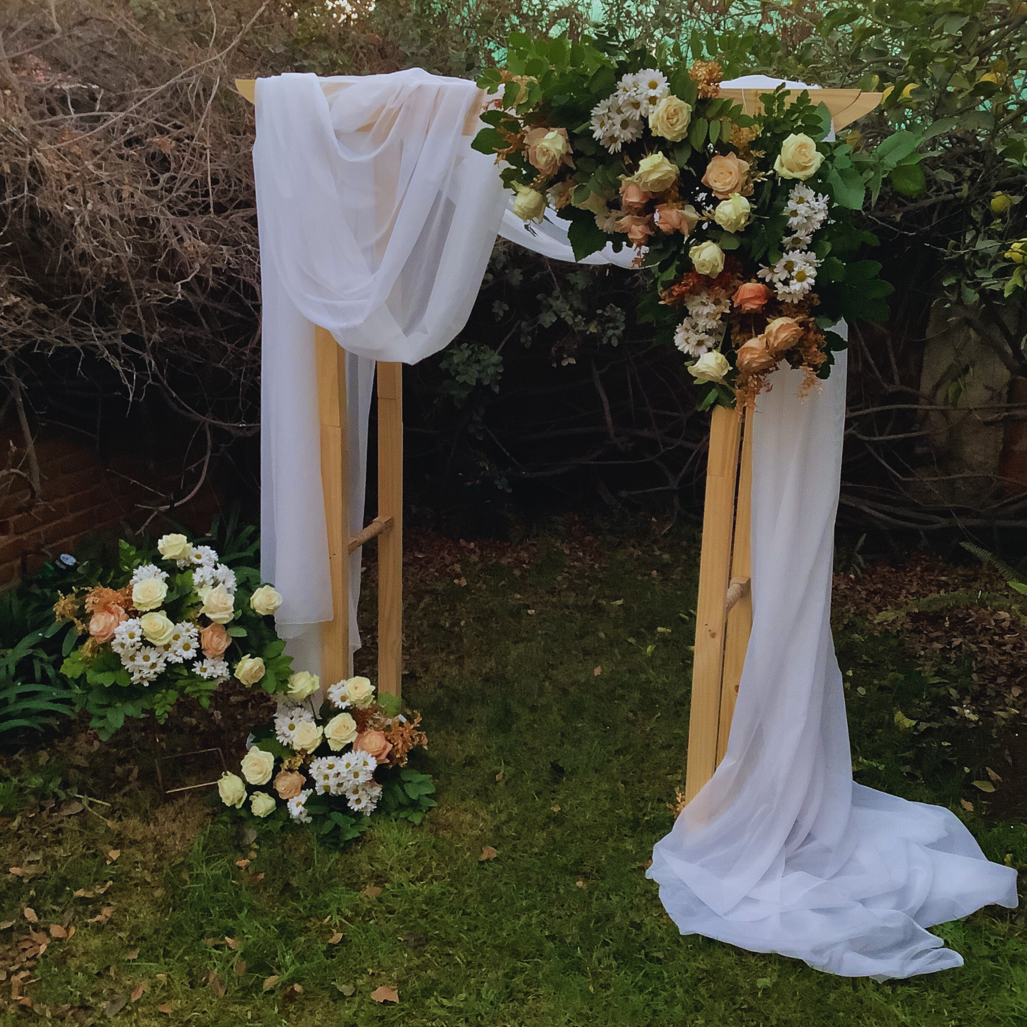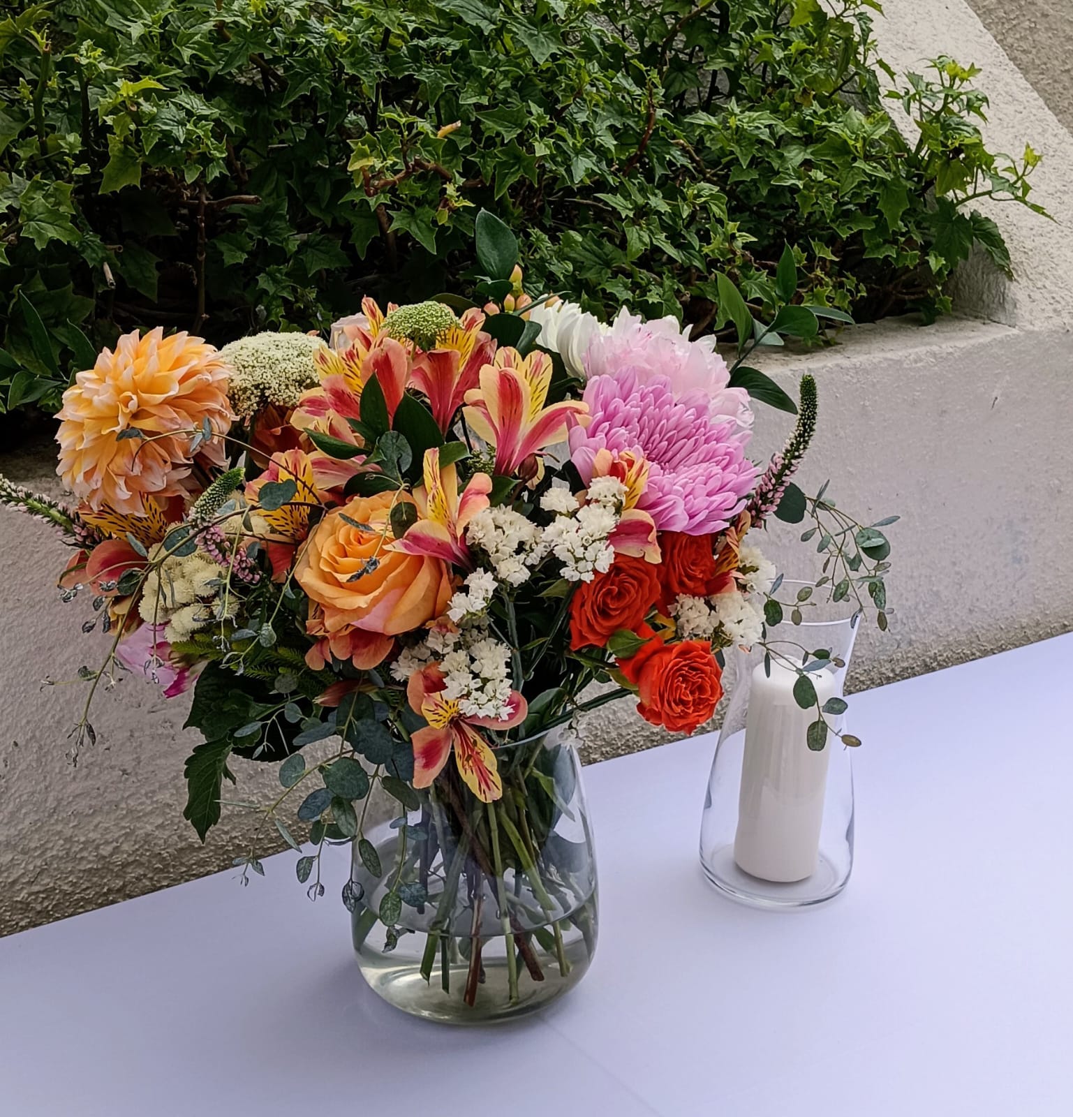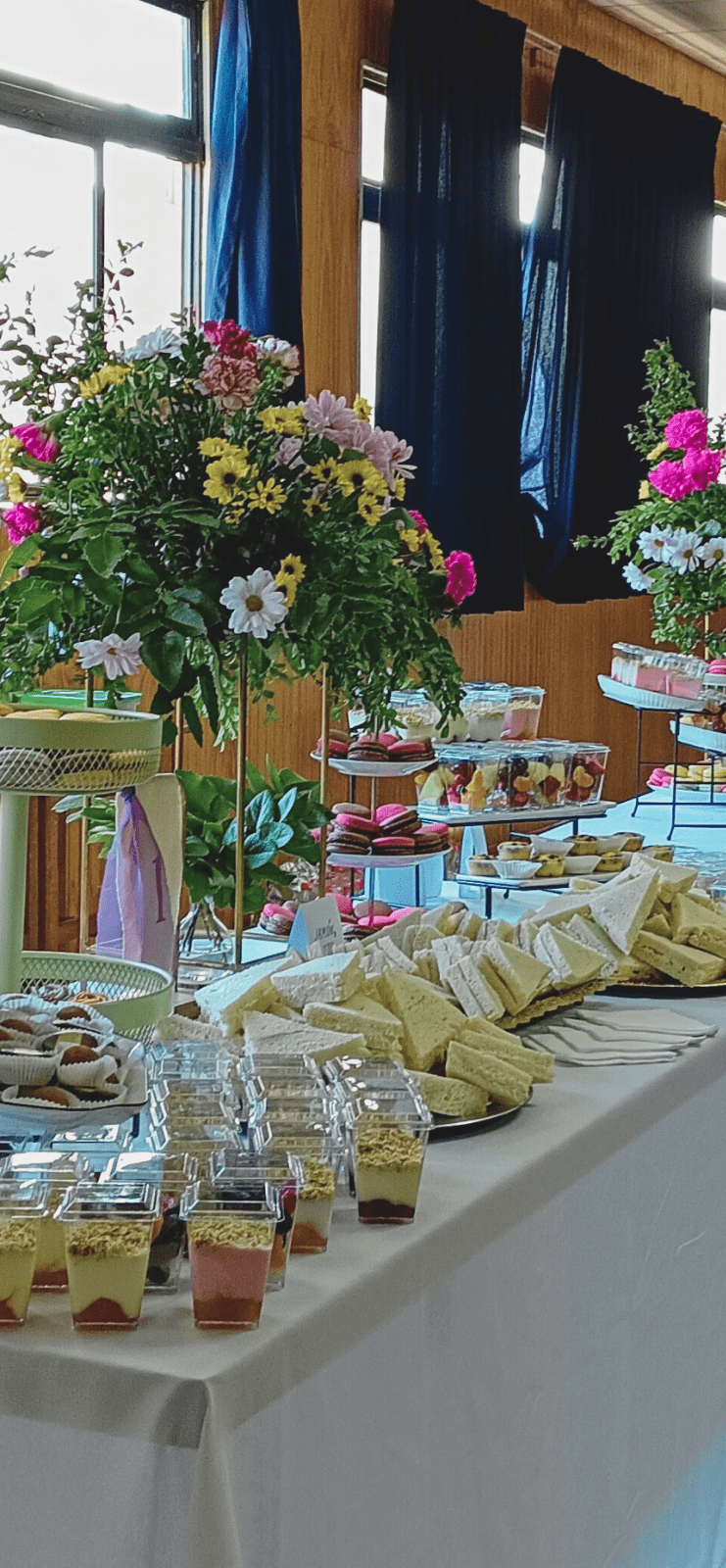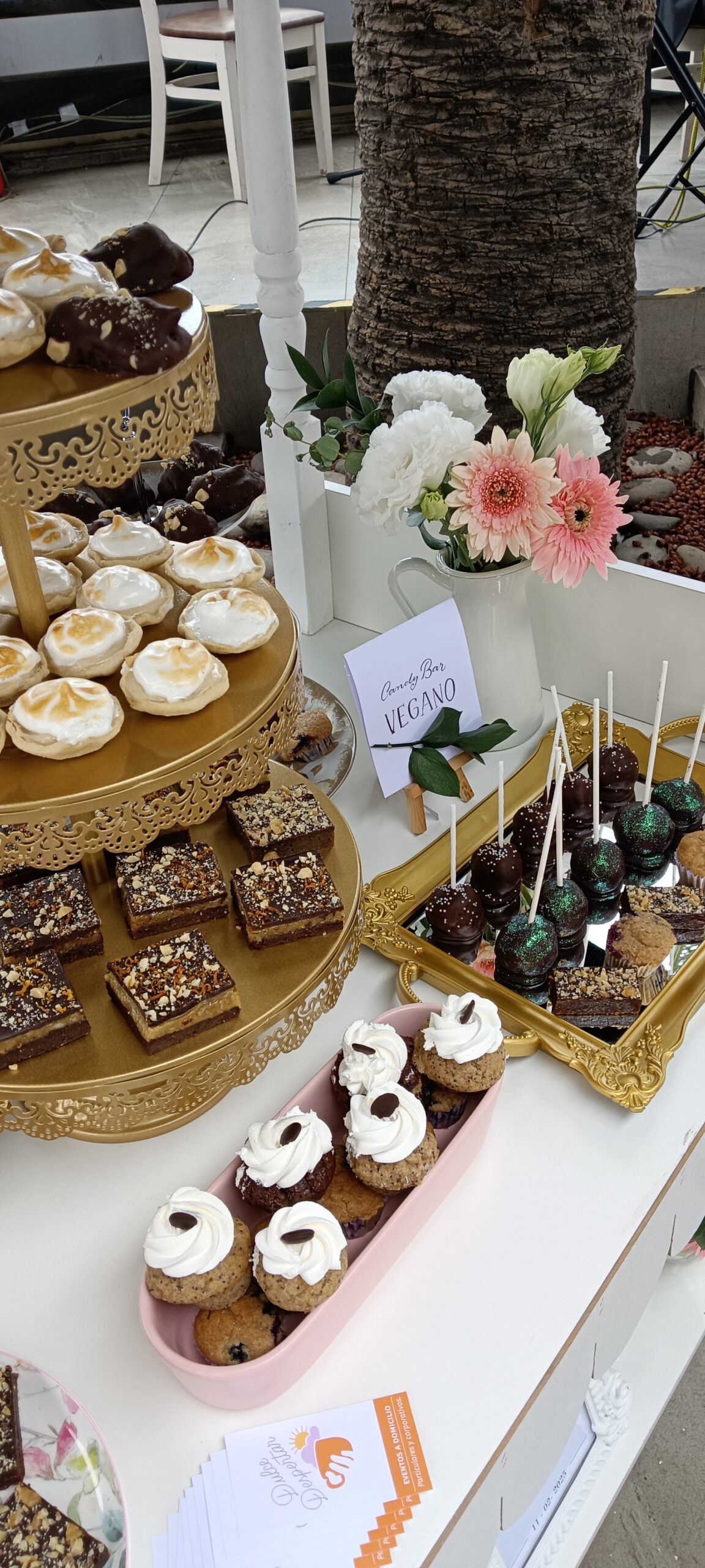 Montaje buffet elegante y temático, cuidadosamente decorado con flores naturales frescas que aportan color y calidez al espacio.