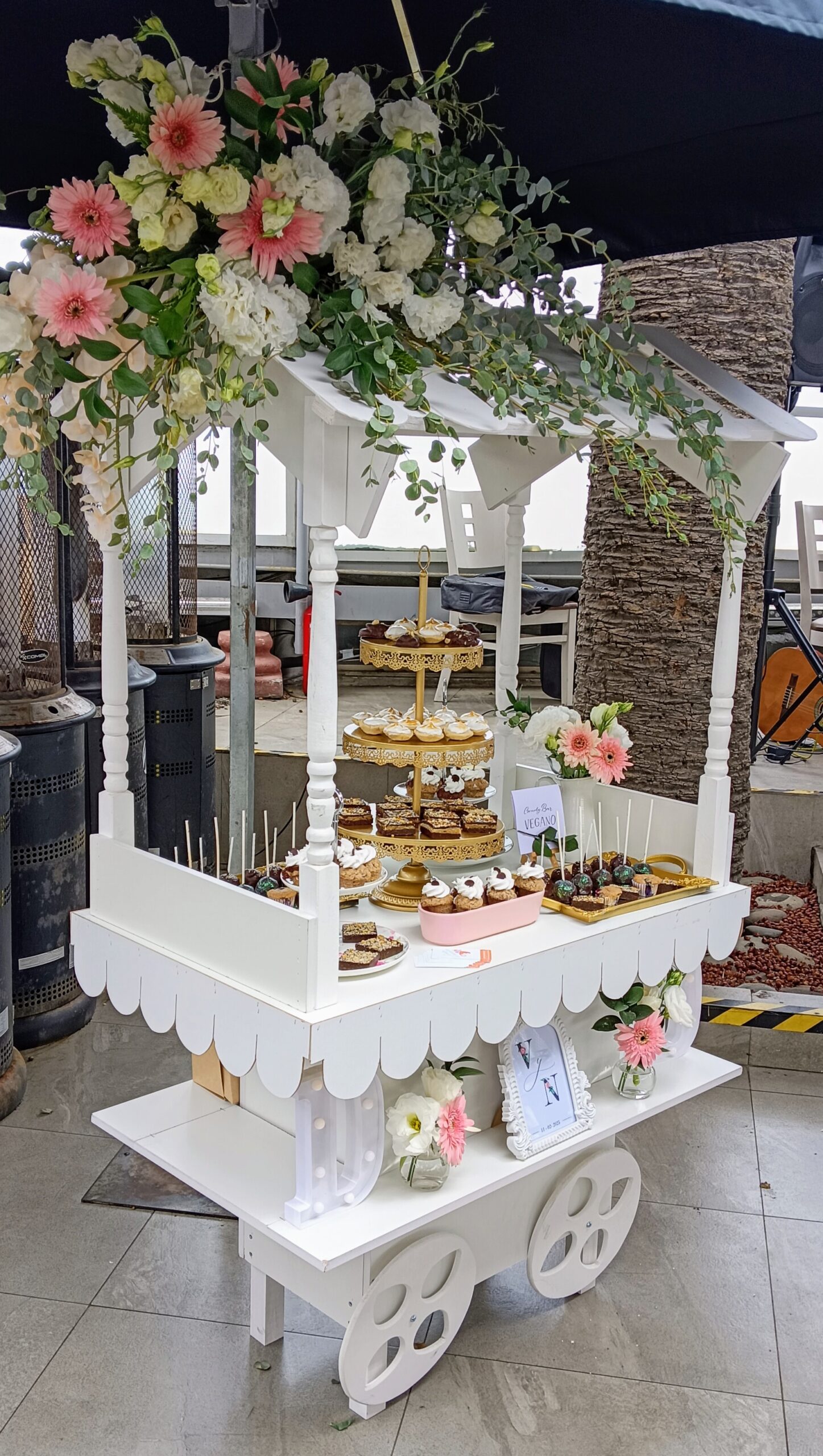 Disfruta de un rincón dulce presentado en un encantador carrito de madera, cuidadosamente decorado con detalles especiales que realzan su estilo y calidez. Incluye una selección variada de golosinas, chocolates y snacks, ideal para que tus invitados se sirvan a su gusto y disfruten de un ambiente divertido, acogedor y lleno de color.